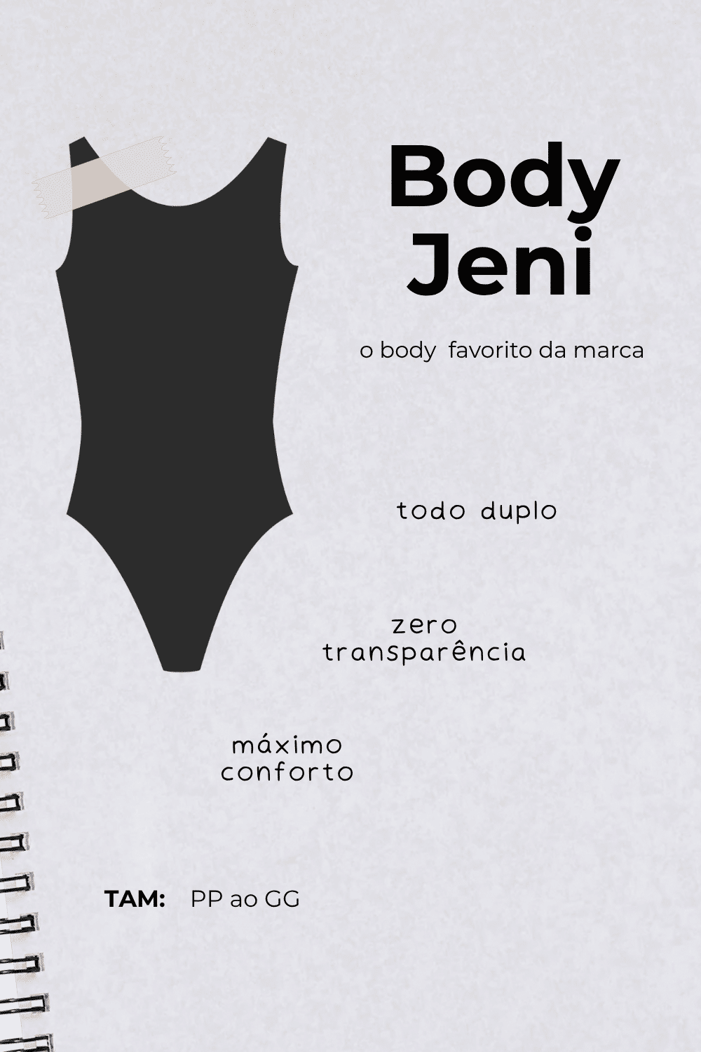 - Modelagem: body bem justo ao corpo, decote redondo e com modelagem nadador com cava mais profunda, que valoriza os ombros e alonga a silhueta