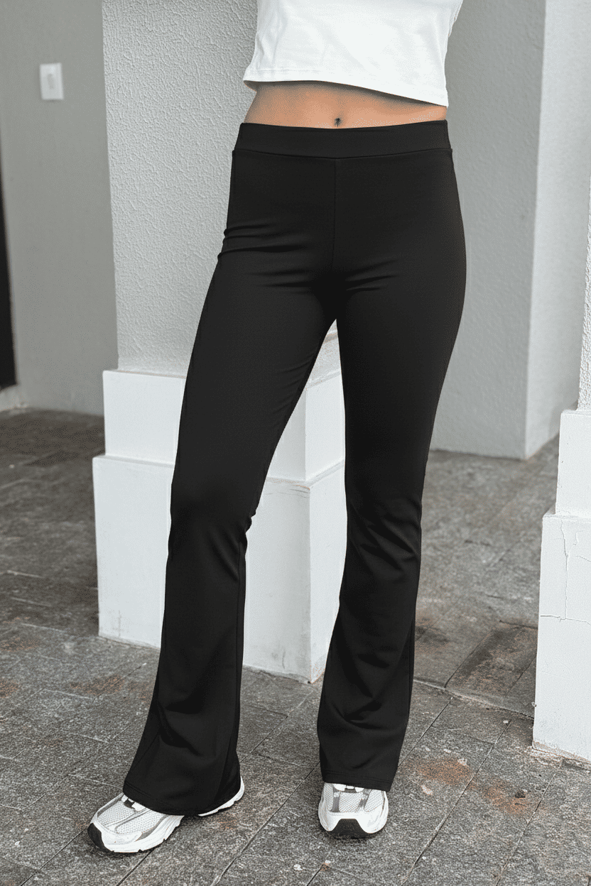 Com cintura alta e caimento justo nas pernas até os joelhos, ela se abre suavemente na barra, criando um efeito alongador. O tecido é confortável e encorpado, ideal para quem busca estilo com liberdade de movimento.