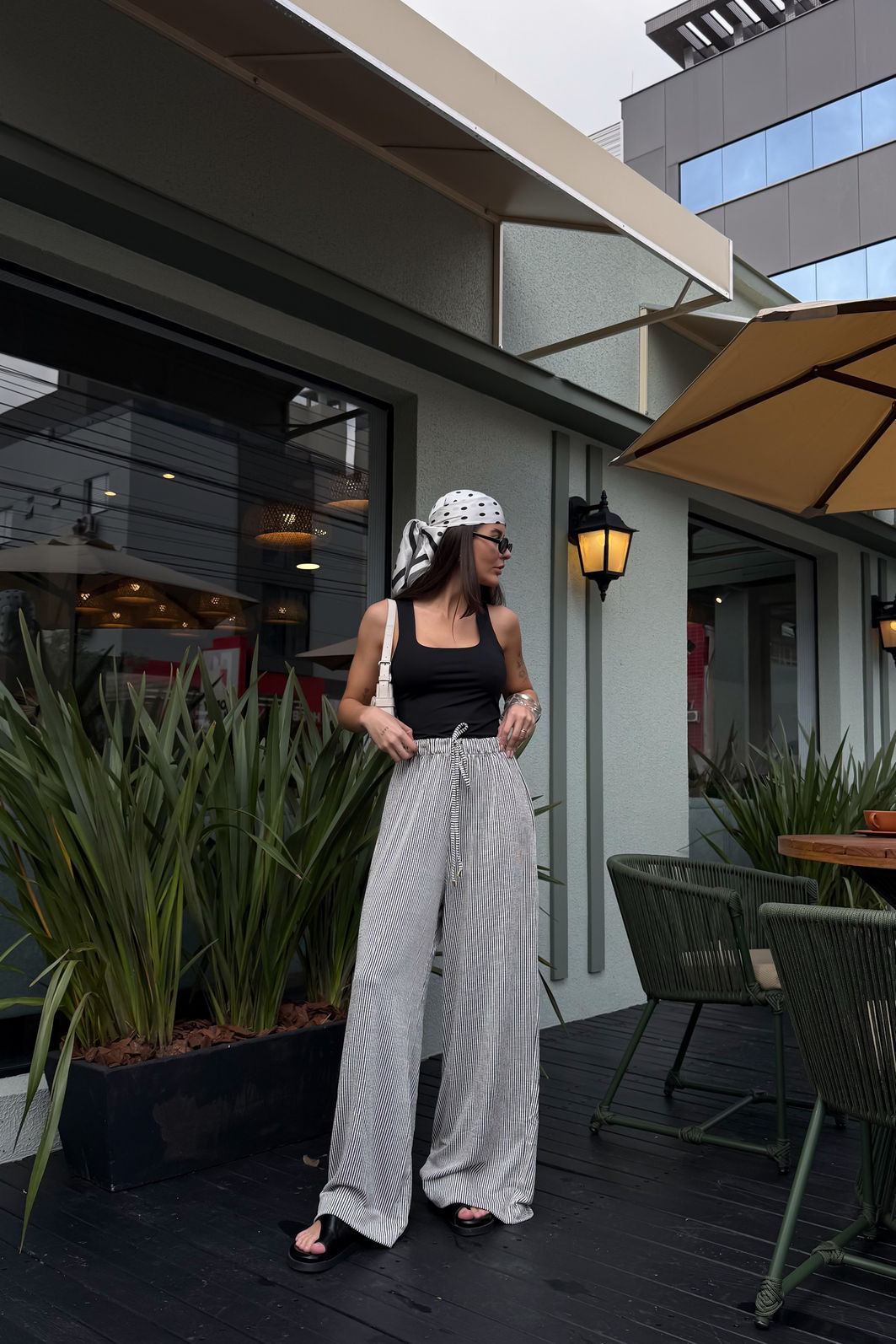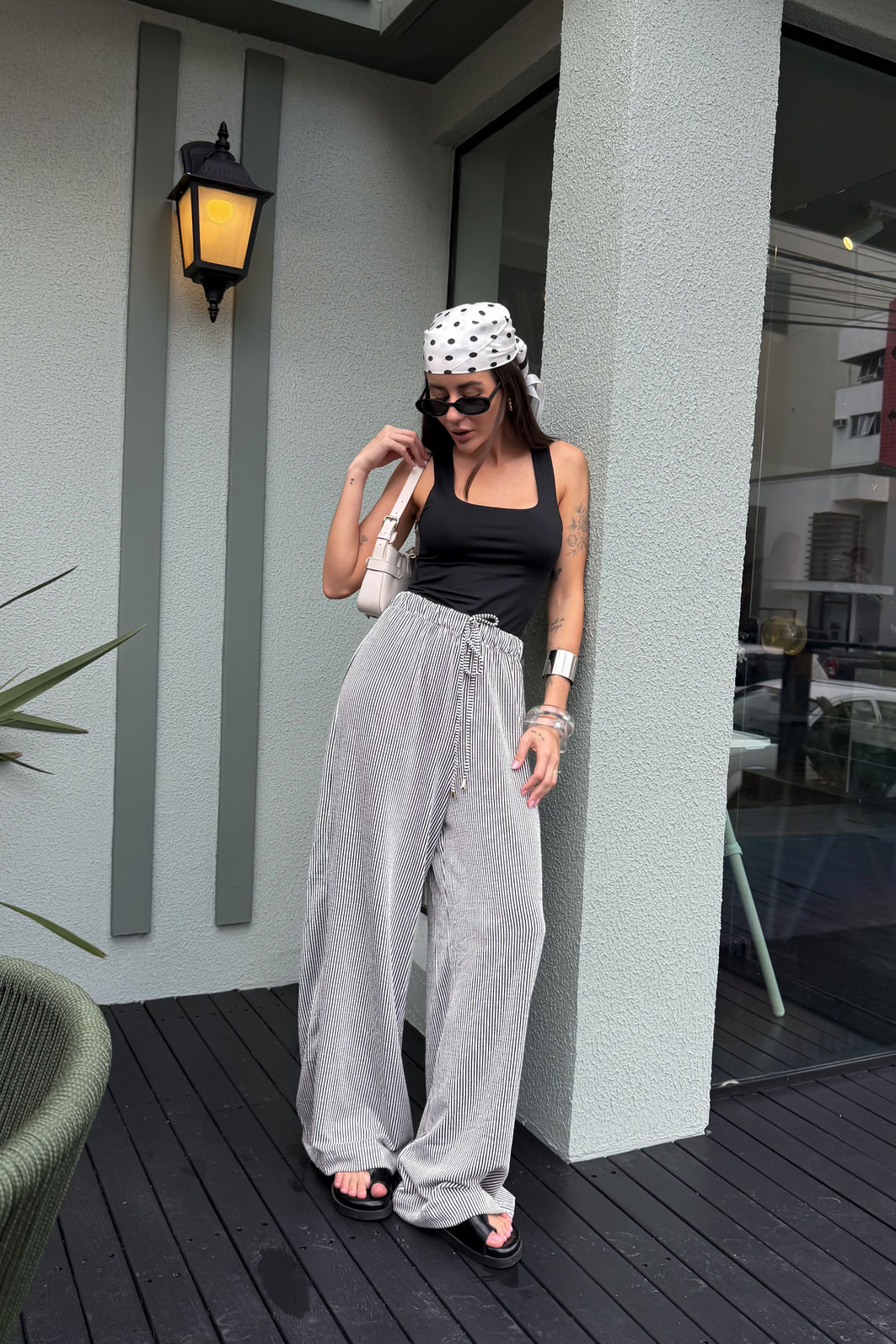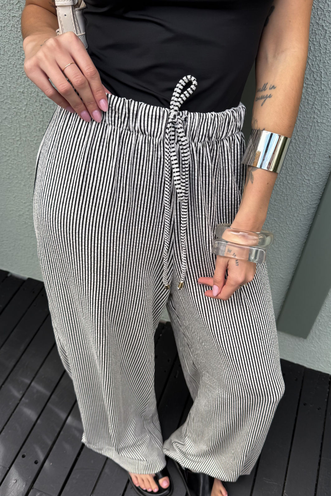 AdicionarA calça Louise tem aquela presença tranquila que resolve o look sem esforço. Confeccionada em malha texturizada com listras finas preto e branco, o tecido mescla viscose, linho e elastano em uma combinação que entrega uma peça fluida, com toque suave e movimento. A modelagem reta de perna larga alonga a silhueta. O cós com elástico embutido e cordão com ponteira garantem ajuste confortável e um acabamento que faz diferença. Os bolsos funcionais laterais completam a proposta comfy da calça.