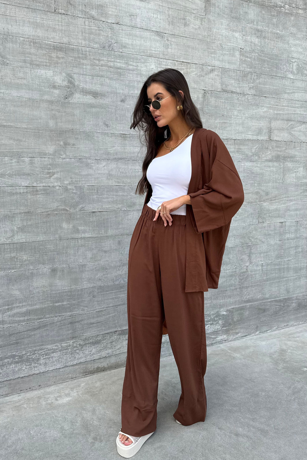 AdicionarKimono é sempre uma peça chave para a composição de looks que pedem uma sobreposição. A modelagem do nosso kimono Bianca é bem quadrada e ampla e as mangas com os recortes adicionam um detalhe sutil ao design, trazendo ainda mais charme à peça. Por ser tamanho único, ele veste desde o PP até o GG de forma bem confortável e mantendo a proposta de uma terceira peça.