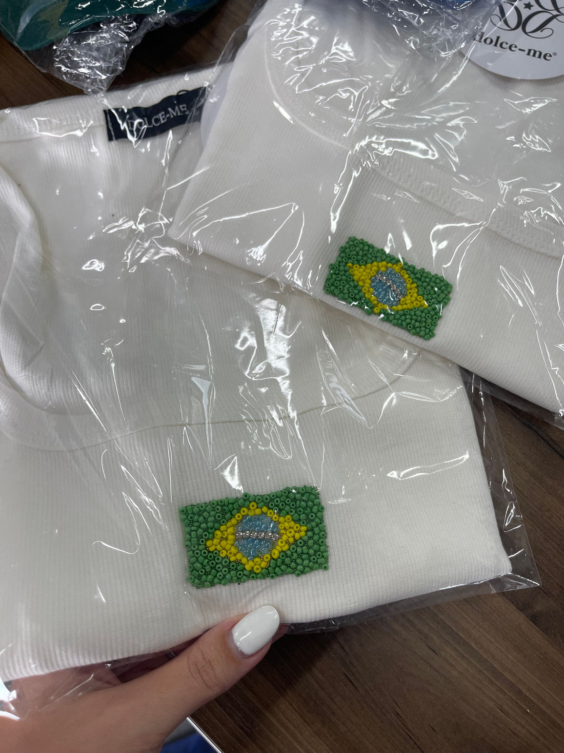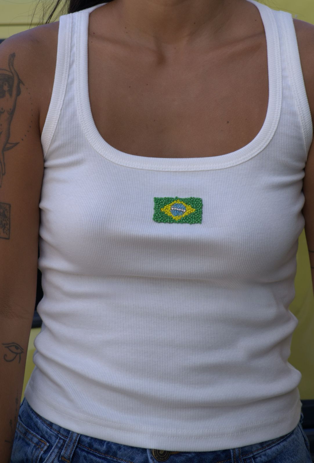 A regata carol é uma peça certeira para compor produções práticas e modernas. Confeccionada em ribana canelada 2x2 de algodão macio, ela possui textura encorpada e elasticidade na medida certa, vestindo perfeitamente no corpo, o detalhe do decote quadrado destaca o colo na medida certa. A bandeira é confeccionada em miçangas e aplicada com termocolante.