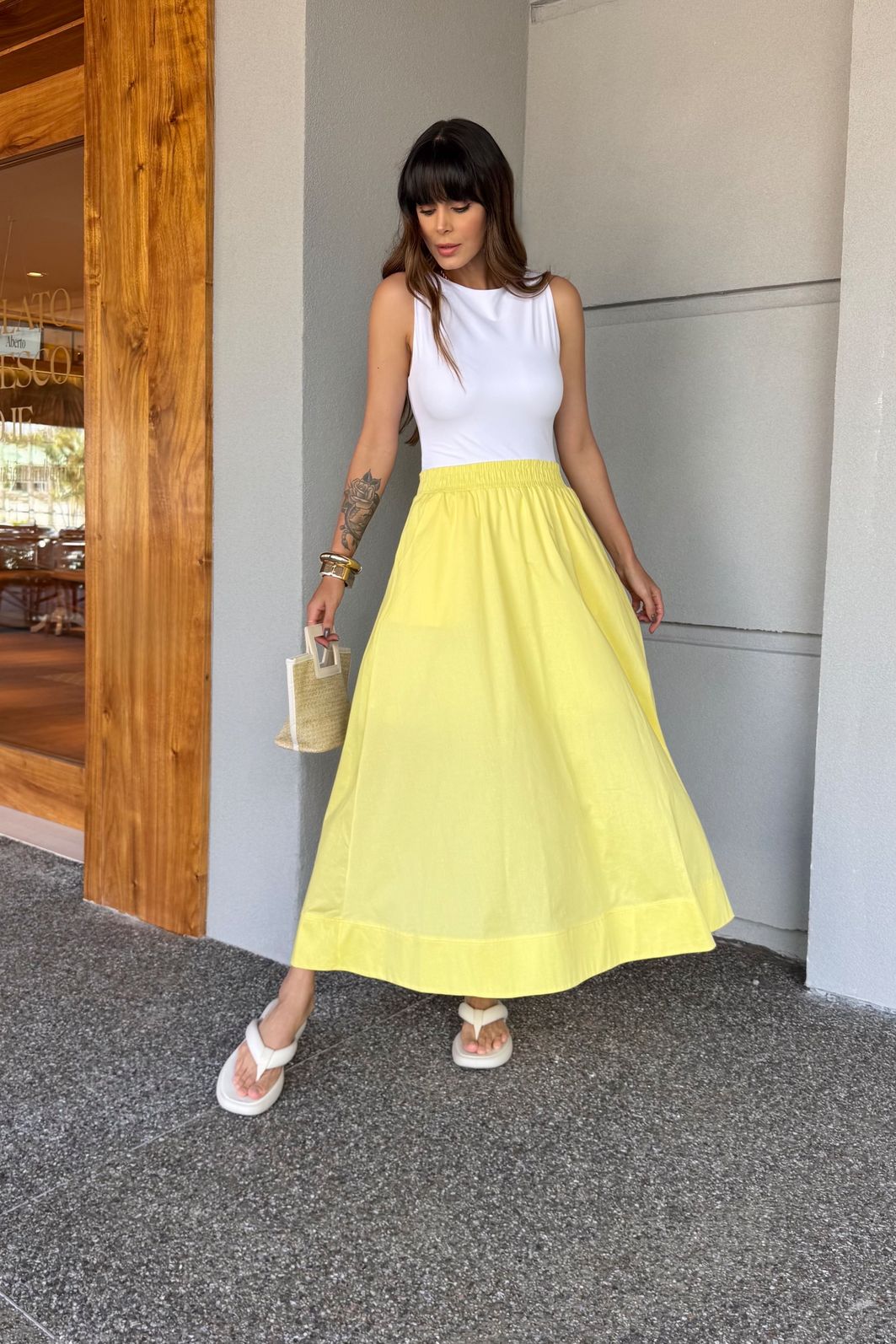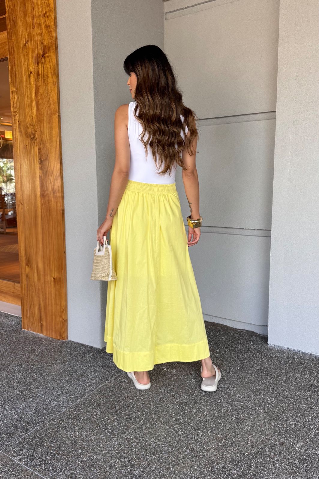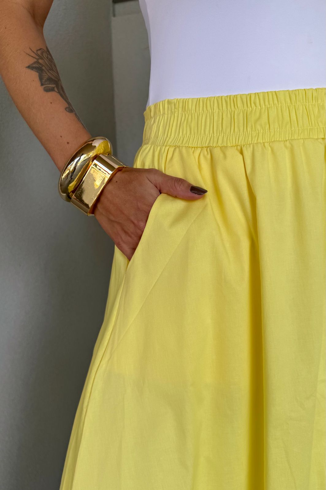 | Detalhes | Saia de comprimento midi com forro, elástico na cintura, bolsos funcionais e acabamento de barra dupla com pesponto interno. |