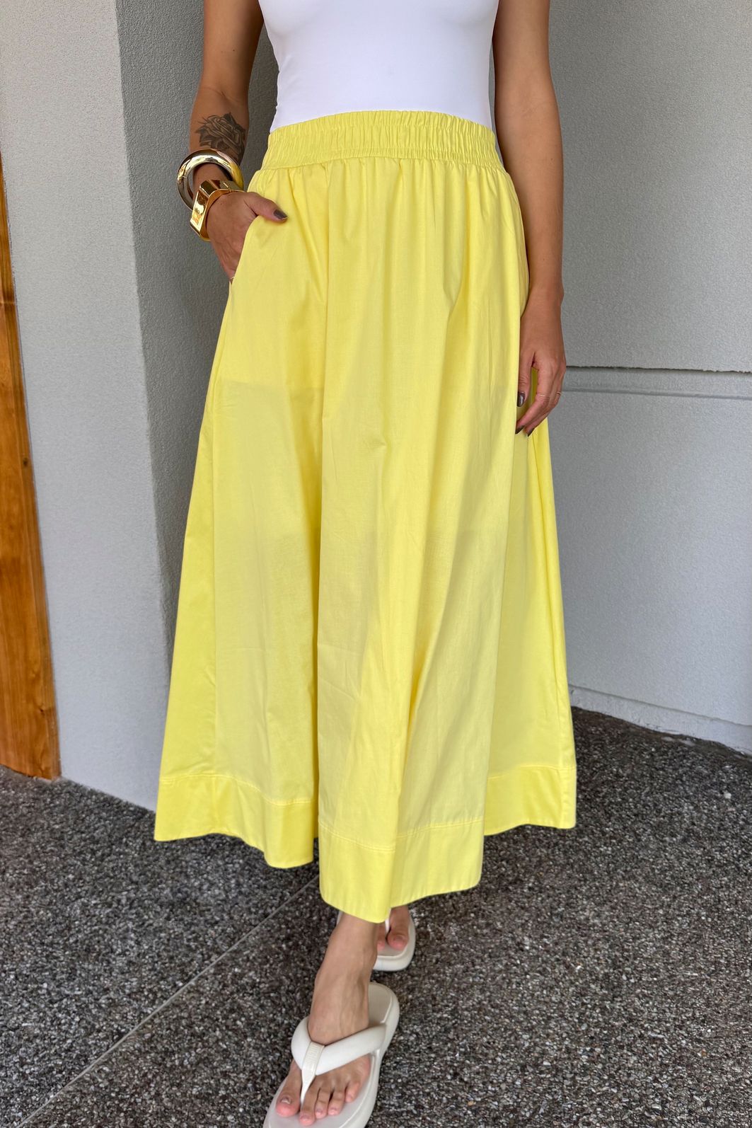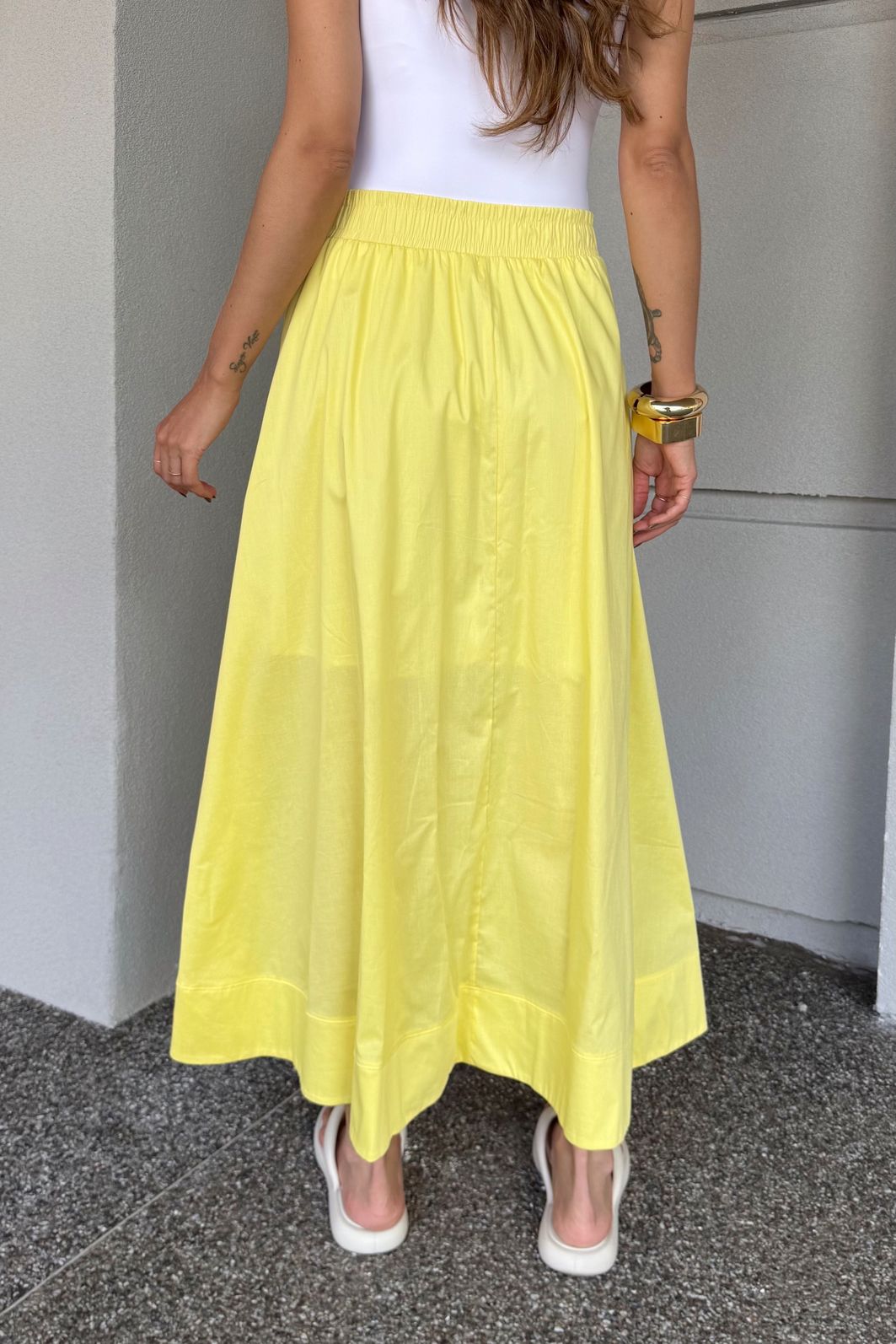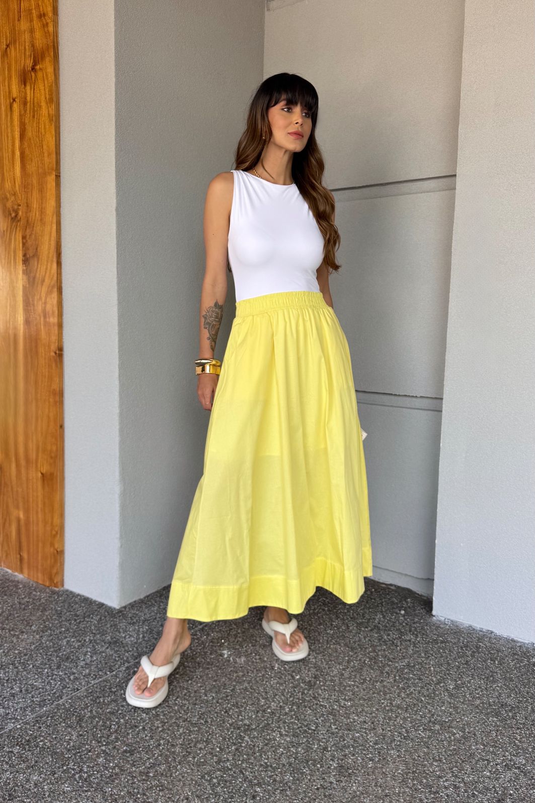 | Detalhes | Saia de comprimento midi com forro, elástico na cintura, bolsos funcionais e acabamento de barra dupla com pesponto interno. |