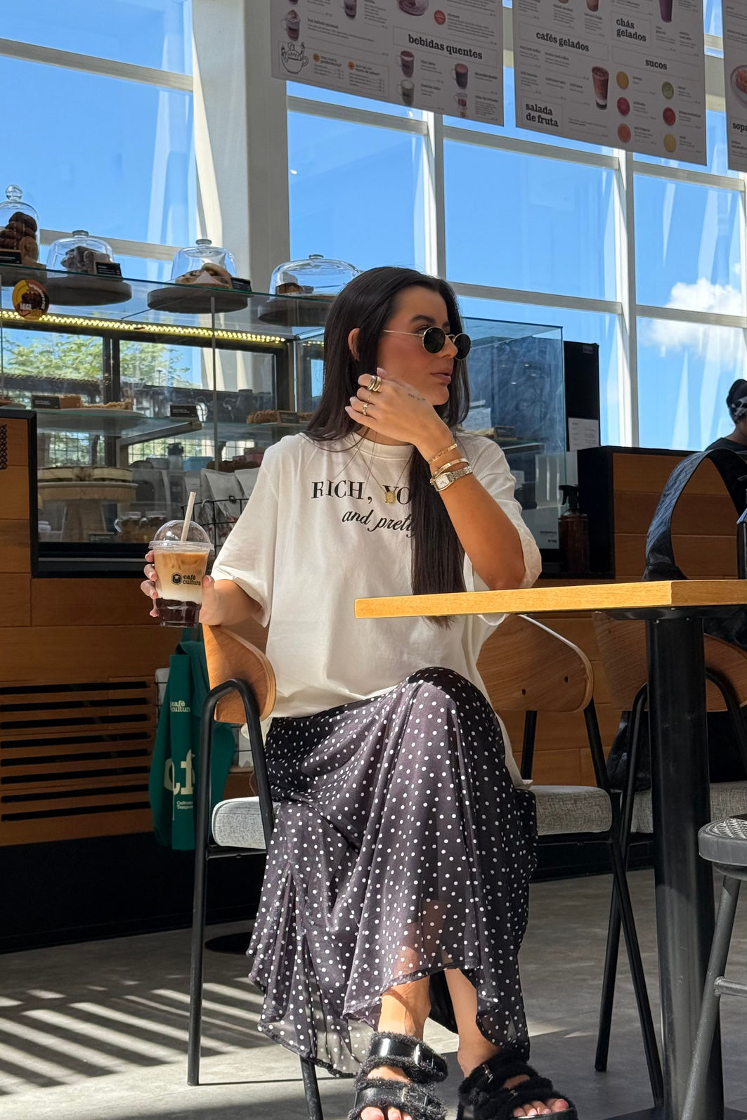 AdicionarDelicada na estética, prática na vida real! Essa saia midi em tule traz o clássico poá em uma leitura atual, com caimento leve e movimento que acompanha o corpo sem pesar. O cós com elástico garante ajuste confortável e facilita na hora de vestir. A saia Chloe é aquela peça que funciona do look mais despojados com t-shirt até produções mais arrumadas. Um equilíbrio perfeito entre feminilidade e versatilidade, pensada pra garantir looks lindos no dia a dia e ainda elevar o visual.