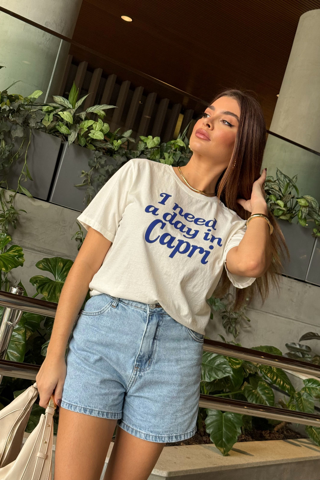 Com mood leve e sofisticado, a t-shirt Day in Capri é a peça perfeita para quem ama looks com toque de frescor e elegância casual. Confeccionada em meia malha 100% algodão, oferece toque macio, caimento soltinho e conforto o dia todo. O lettering “I need a day in Capri” traduz o desejo por dias ensolarados e cheios de charme mediterrâneo, adicionando um ar despretensioso e inspirador ao visual. Ela é ideal para compor produções leves e estilosas, seja com jeans, saias ou peças de alfaiataria.