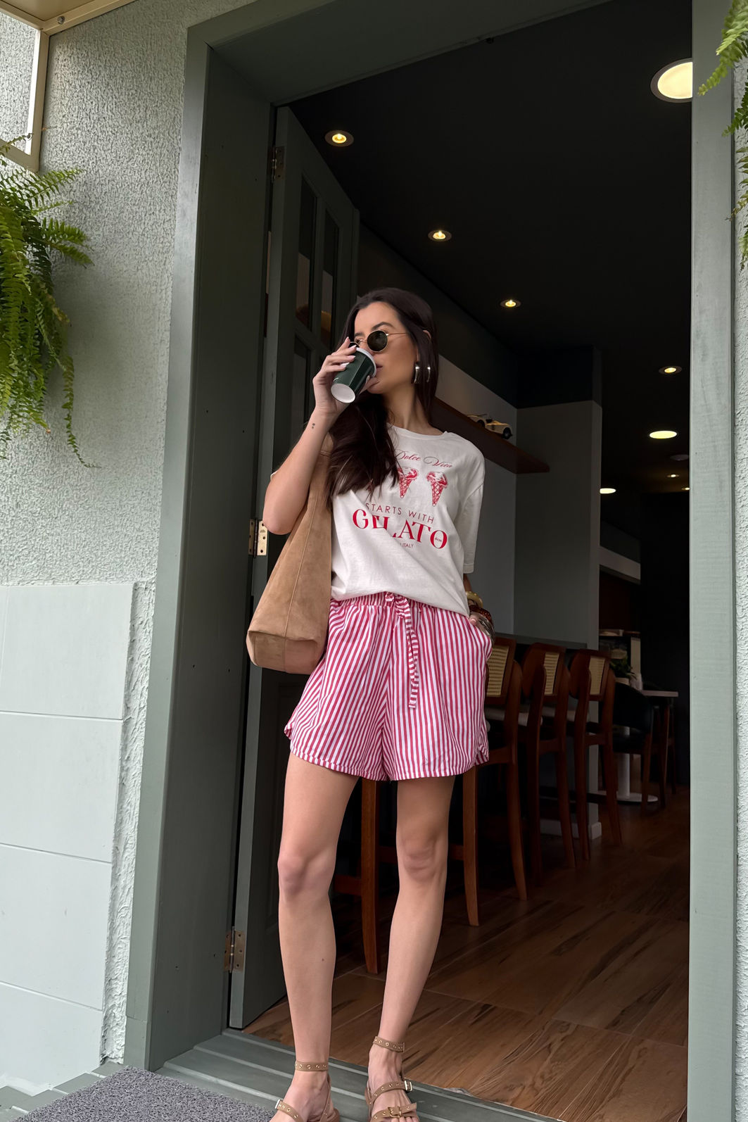 Doce, leve e cheia de estilo! A t-shirt estonada Gelato é aquela peça que une conforto, atitude e um visual cheio de personalidade. Confeccionada em meia malha 100% algodão com lavagem estonada, ela tem toque macio e caimento soltinho que faz toda a diferença. A estampa em tom de vermelho sobrepondo o off white traz um toque vibrante e divertido, perfeita pra quem ama um mood leve e com personalidade. Combine com jeans, shorts ou saias para um look casual e cheio de charme, ideal para curtir o dia com estilo e uma pitada de doçura.