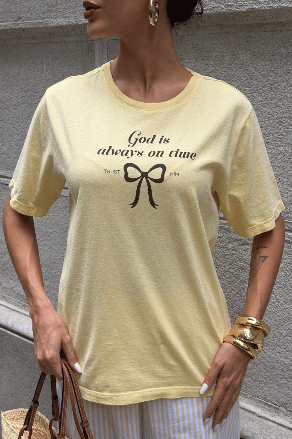 se você procura t-shirt amarelo manteiga estampada, essa é a peça certa. a t-shirt estonada god is always amarelo manteiga da dolce-me é confeccionada em malha pt pré-encolhida 100% algodão, com estampa localizada frontal em silk screen, o que garante toque macio, respirabilidade e durabilidade sem desbotar com facilidade. a frase god is always traz mensagem de fé e positividade, deixando a peça ainda mais especial.