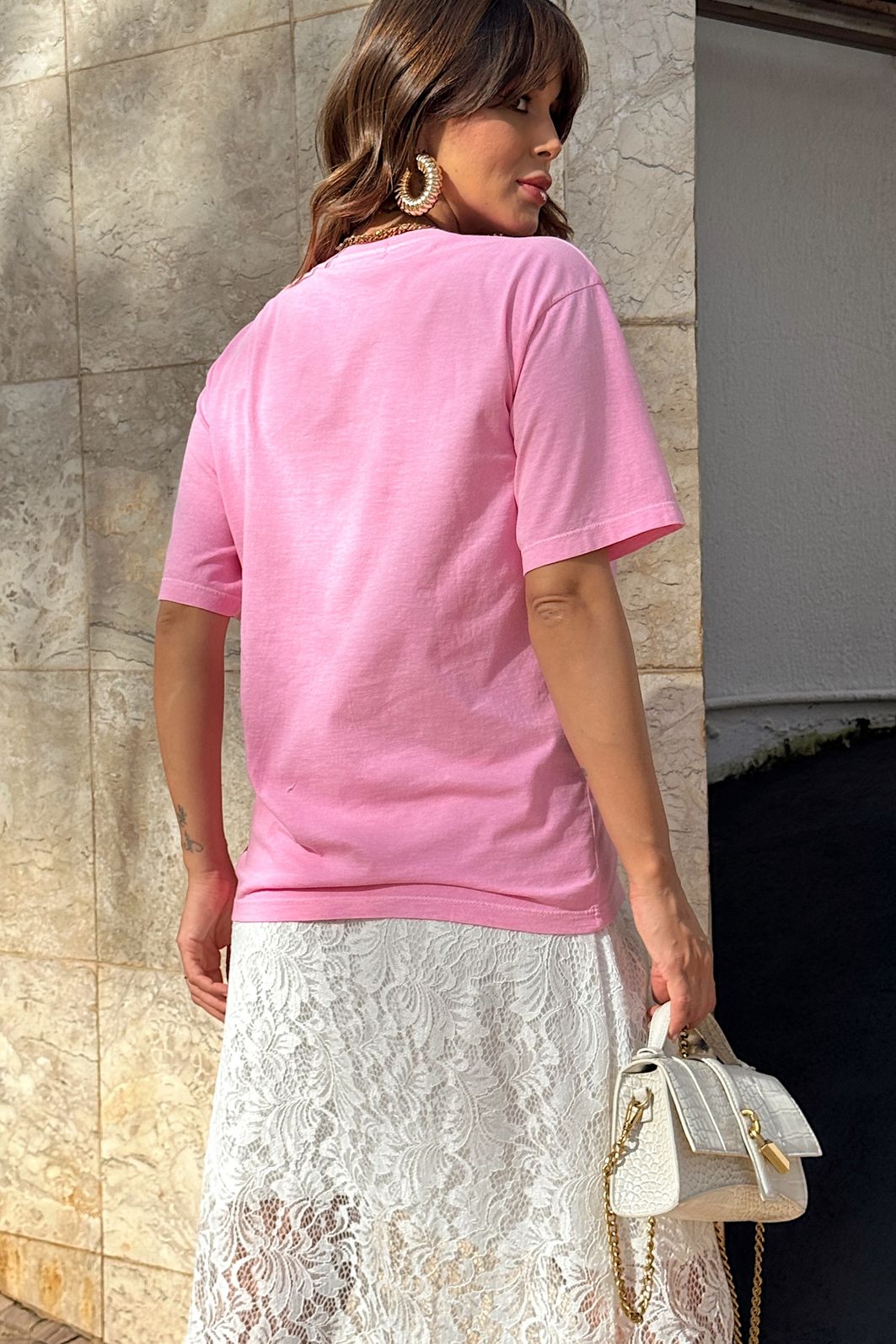 A modelagem é tradicional, com caimento confortável no corpo, ideal para quem quer praticidade sem abrir mão de estilo. Funciona tanto para looks casuais quanto para produções mais descoladas, combinando facilmente com jeans, shorts, saias ou calças de cintura alta. É aquela t-shirt versátil que entra no guarda-roupa e realmente é usada.