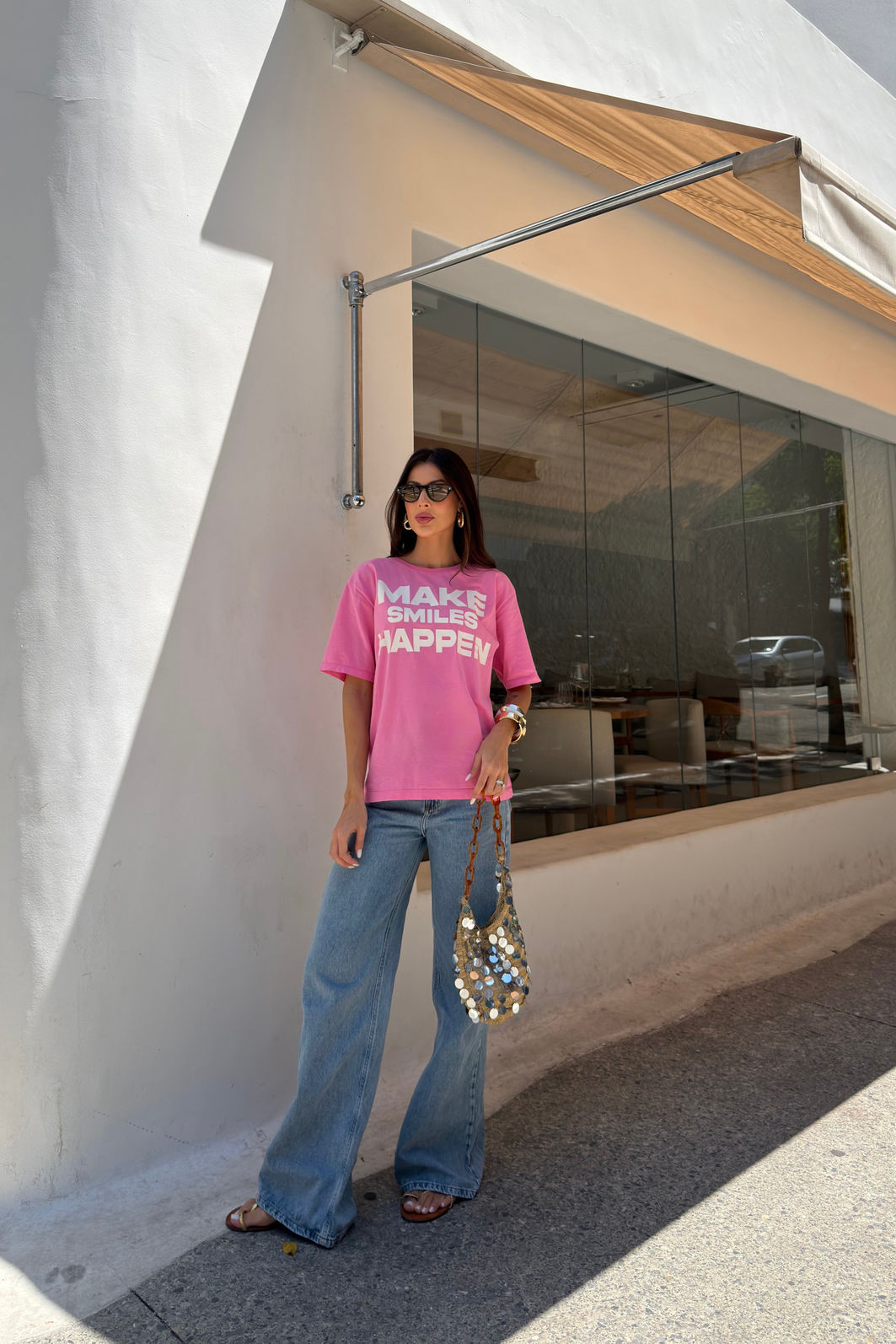 Porque é confortável, versátil e transmite uma mensagem leve. A T-shirt Make Smiles une algodão de qualidade, modelagem clássica e estampa em silk screen, que não é transfer nem sublimação, garantindo um visual mais premium. É o tipo de peça que traz boas vibrações para o look sem esforço.