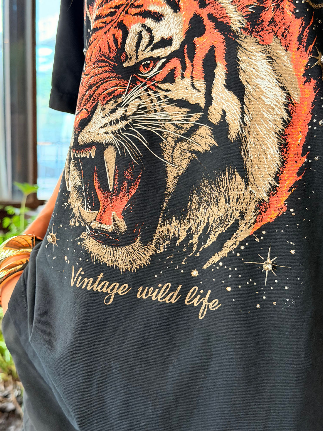 a t-shirt estonada roaring tiger com aplique preta da dolce-me é confeccionada em malha pt pré-encolhida 100% algodão, com estampa localizada frontal em silk screen e aplique, o que garante toque macio, respirabilidade e efeito visual marcante. o detalhe em aplique traz textura e profundidade para a arte, deixando a peça ainda mais impactante.