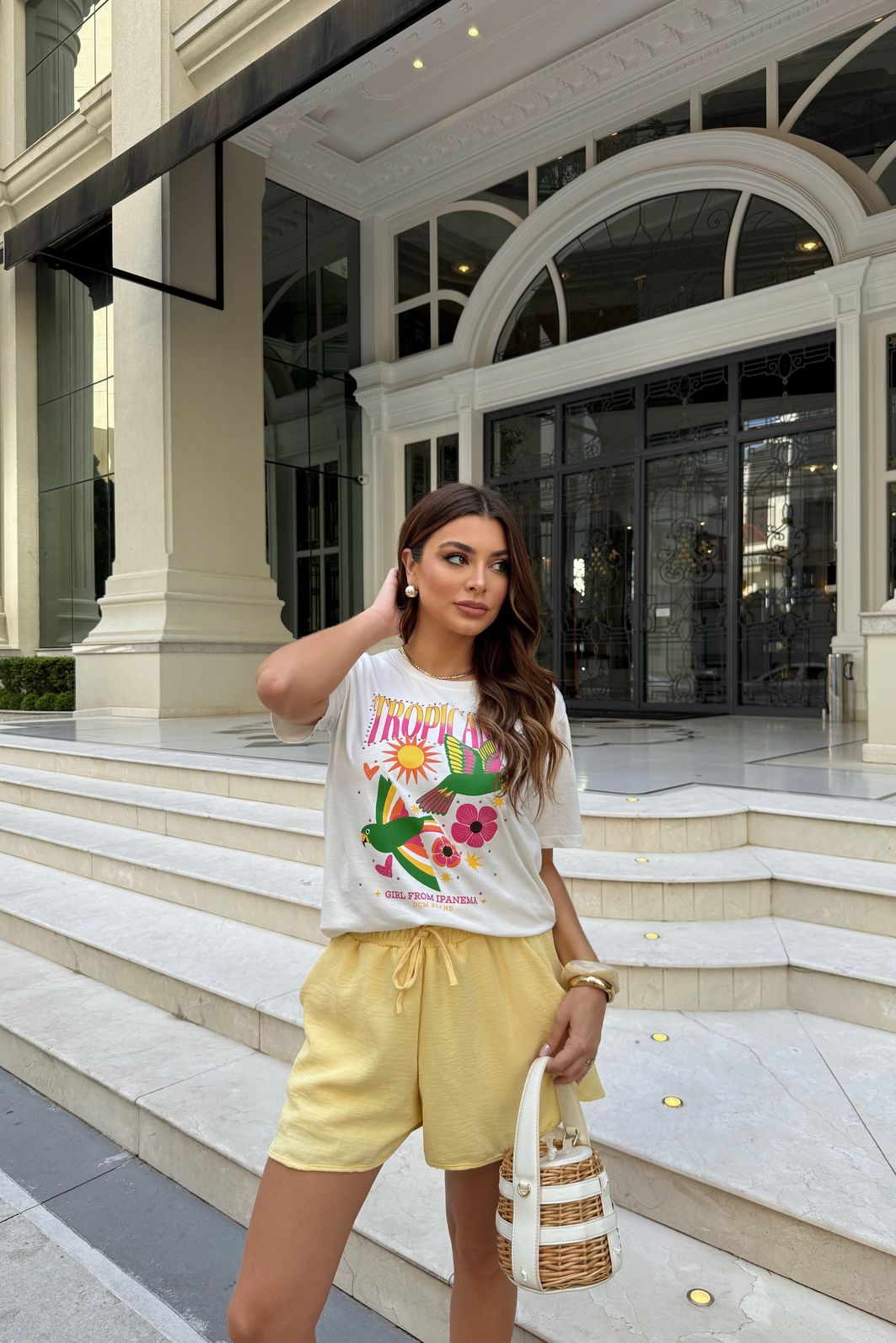 Com um toque vibrante e cheio de personalidade, a t-shirt Tropicana é perfeita para quem ama unir conforto e estilo em um visual moderno e descontraído. Confeccionada em meia malha 100% algodão, ela oferece toque macio e caimento perfeito, ideal para looks cheios de charme sem esforço. A estampa com elementos tropicais ganha destaqueespecial com aplicação em strass, adicionando brilho e sofisticação de forma delicada à peça. Versátil e estilosa, combina facilmente com jeans, shorts ou saias, trazendo um mood alegre e cheio de personalidade às produções do dia a dia.