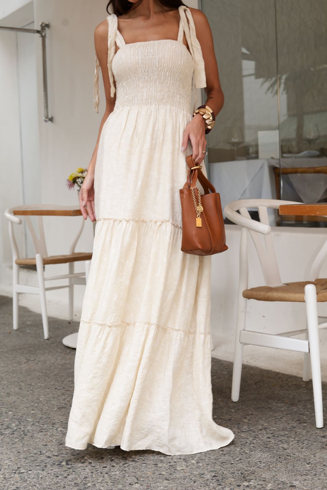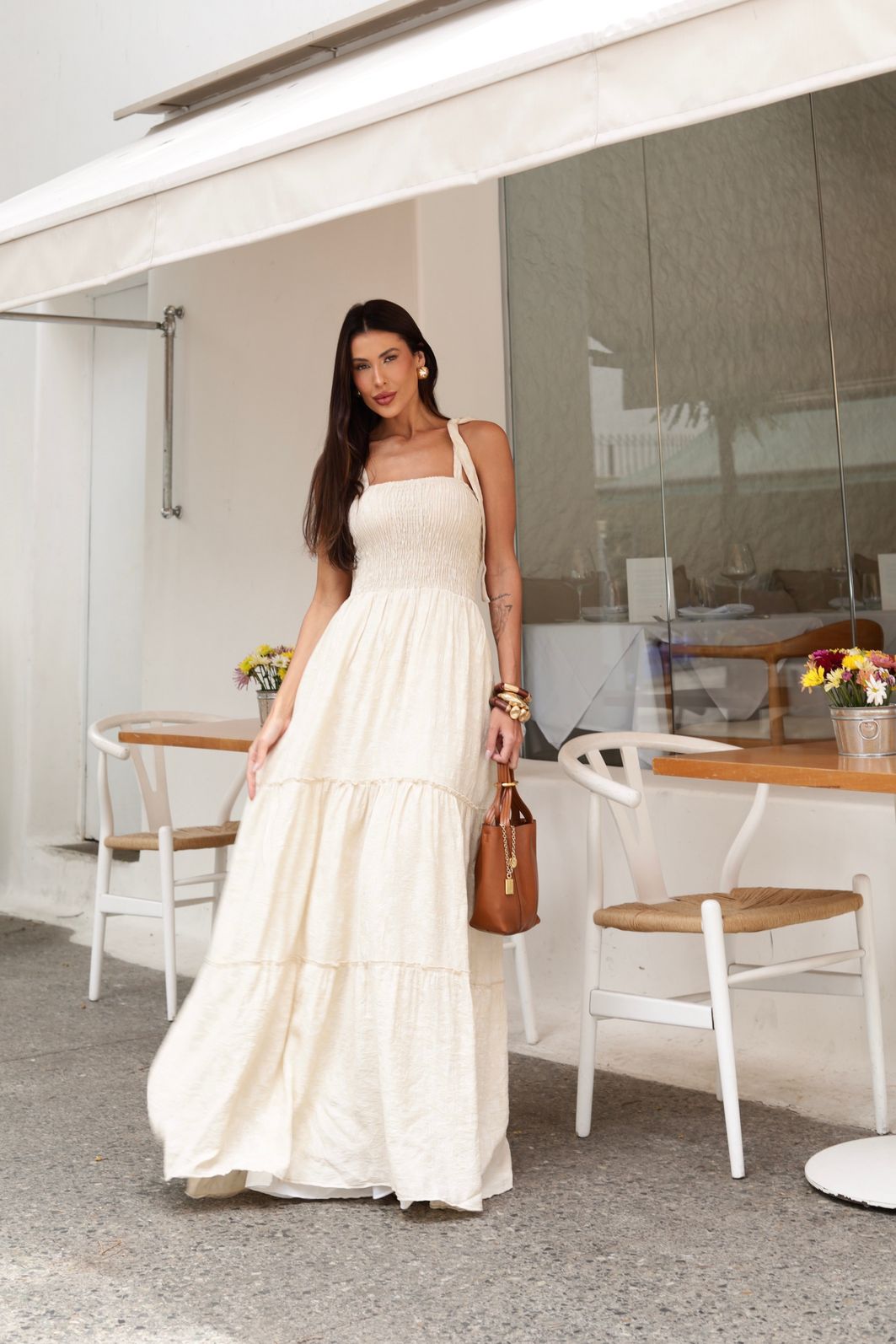 | Detalhes | Vestido com comprimento longo em viscose texturizada, forro, alças de amarrar, decote reto, busto total em lastex, recortes com leve franzido e acabamento em bainha. |