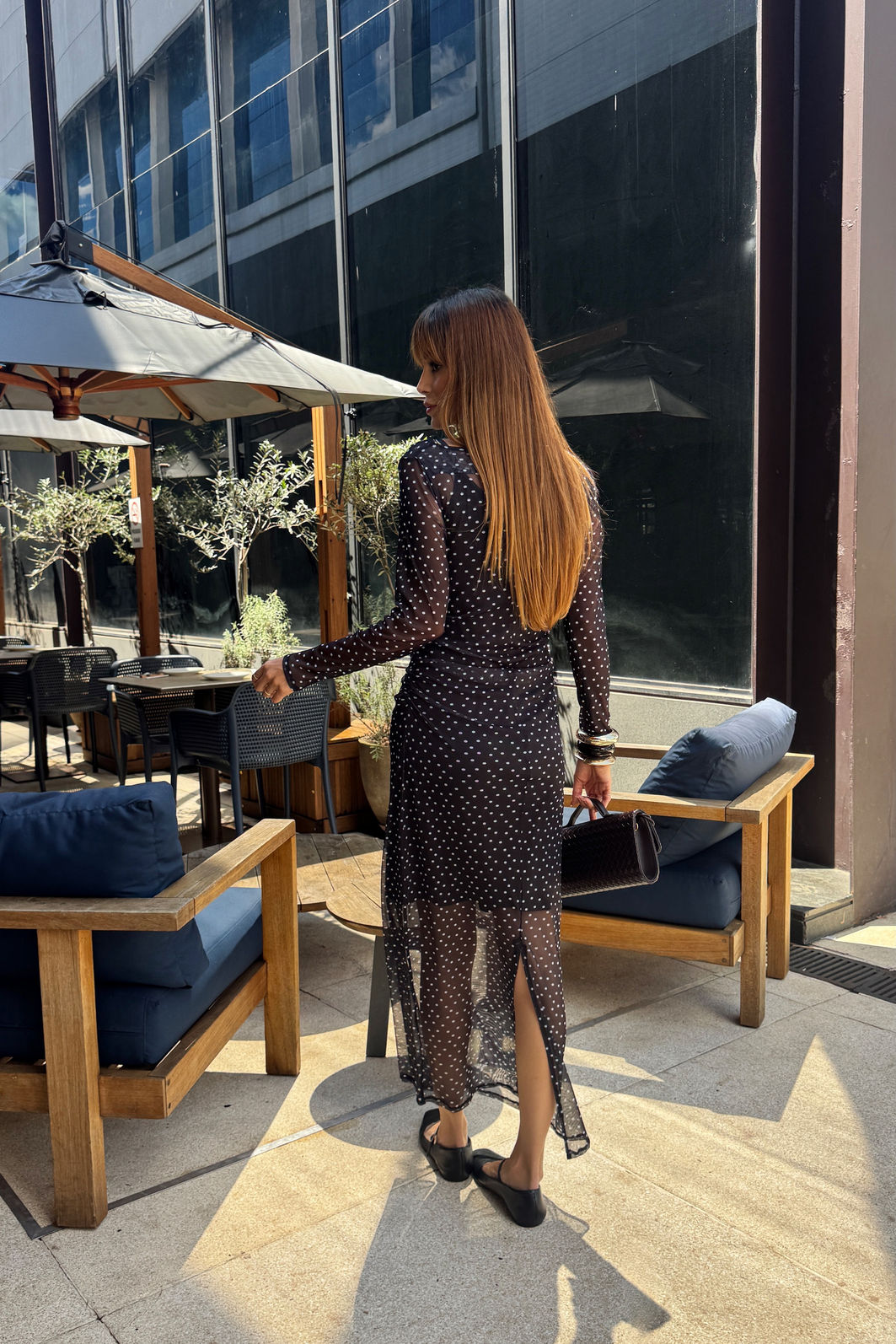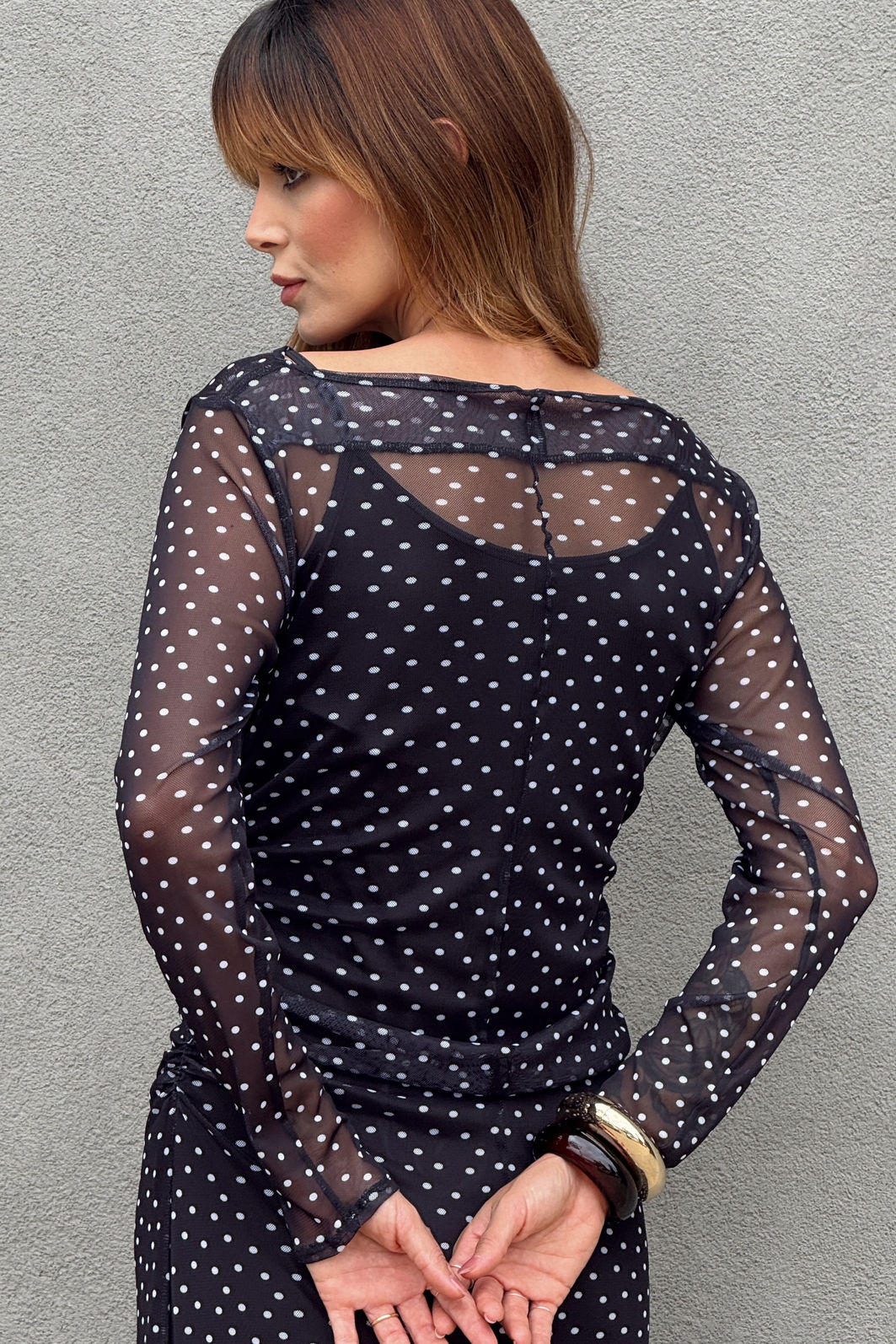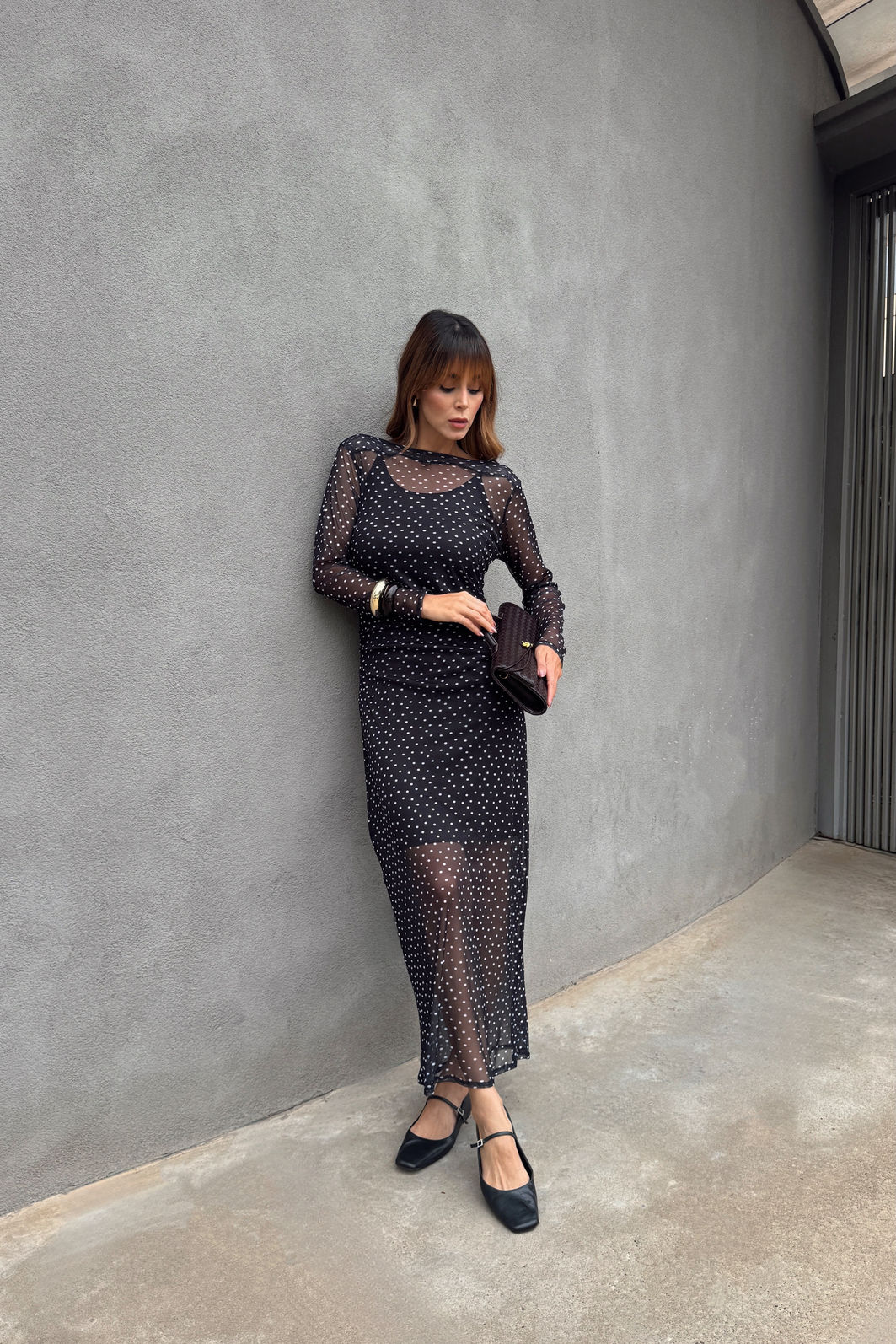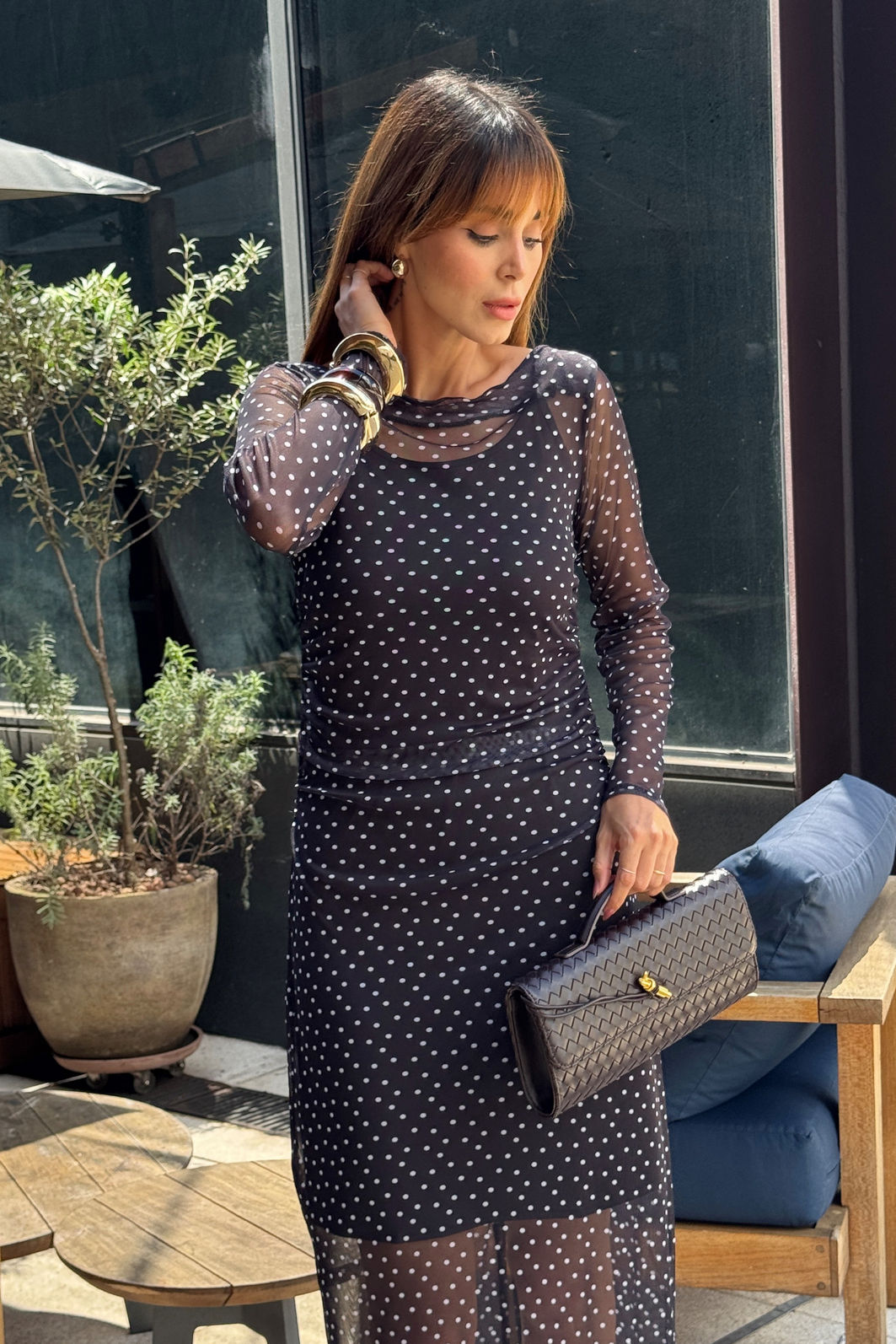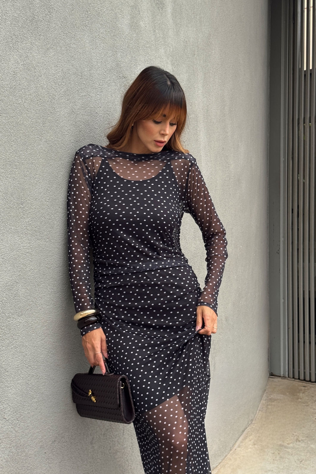 AdicionarO vestido Rosalie é super elegante e marcante na medida certa! Todo em tule com estampa exclusiva, ele tem a modelagem ajustada que desenha toda a silhueta, criando um visual alongado e bem estruturado. O drapeado nas laterais e no quadril valoriza o caimento no corpo com efeito estratégico. Possui mangas longas e decote canoa, passando pela cabeça sem necessidade de fechamento. O detalhe da fenda na parte inferior traseira facilita o movimento ao caminhar. Acompanha vestido interno tipo slip dress bem justo ao corpo, garantindo segurança e praticidade no uso. Uma peça pensada para composições que pedem impacto visual com acabamento refinado.
